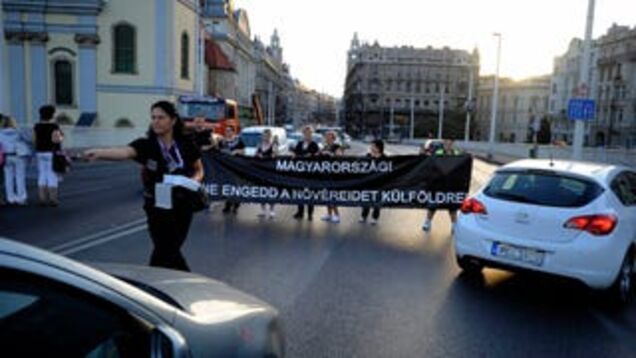 A csoport molinókat tartott, egyiken a Magyarország! Ne engedd a nővéreidet külföldre! felirat volt olvasható.
